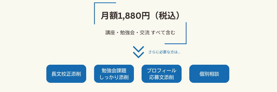 講座も勉強会も、交流も。これらすべてを含めて、月額1,880円(税込)でご利用いただけます。